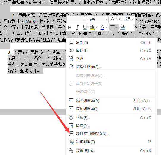 3、右键选择【项目符号和编号】。