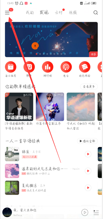 1、打开网易云音乐,进入首页点击左上方的三根横线。