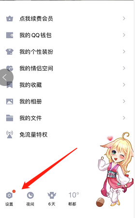 1、首先登录qq号,用手指轻轻向右滑下会出现个人的页面,点击左下角“设置”;