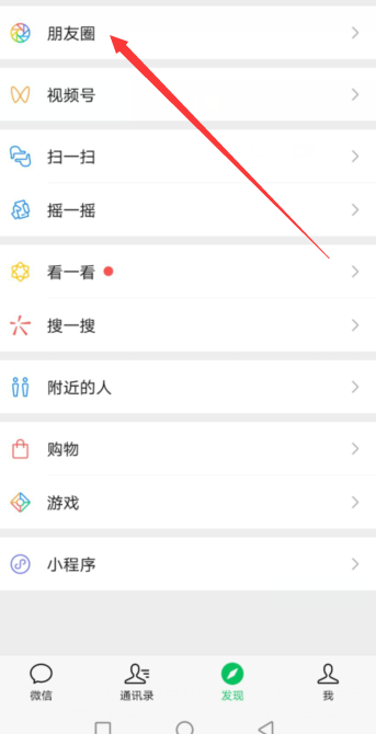 1、打开微信,在发现页面,点击【朋友圈】。