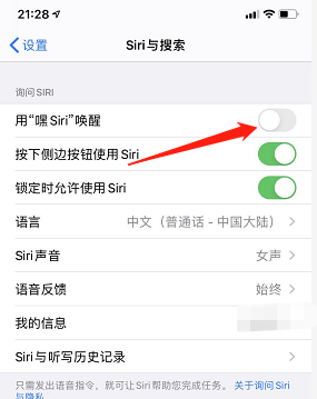 3、接着把【用嘿Siri唤醒】对应的开关选项打开就可以了。