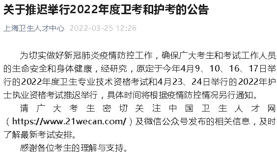 为切实做好新冠肺炎疫情防控工作,确保广大考生和考试工作人员的生命安全和身体健康,经研究,2022年度卫生专业技术资格考试推迟举行。