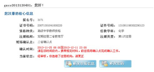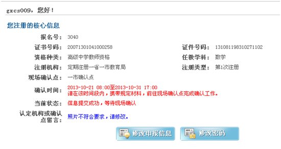 申请人已经到初审注册机构指定的现场确认点确认个人网上申报信息,且提交的申请材料齐全,在等待注册机构审批期间,申请人登录后看到的申请状态为“信息已确认,待审批”。如下图所示: