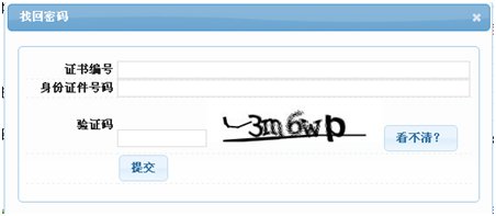 点击“找回密码”链接,输入申报时所填写的证书号码、身份证件号码、及验证码三项信息,点击“提交”按钮,系统会将密码发送至申报时所填写的电子邮箱中,如下面两图: