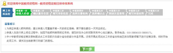 申请人进入申报系统后,可以查看到教师资格定期注册的工作流程,如下图:
