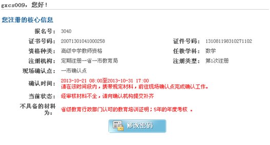申请人已经到初审注册机构指定的现场确认点确认个人网上申报信息,并提交申报材料,但所提交材料不齐全时,其申请状态为“经审核材料不全,请向确认机构提交补齐”。同时可以查看不具备的材料有哪些。如下图所示: