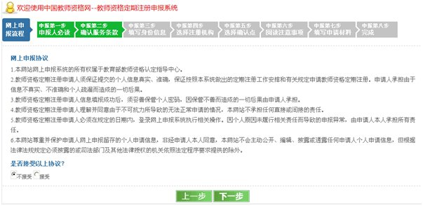 申请人选中“接受”网上申报协议单选按钮,才可点击“下一步”按钮进入申报第三步,否则系统将给出不能继续下一步的提示,如下图所示:
