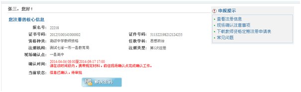 申请人网上申报成功后,需打印教师资格定期注册申请表,并在现场确认时随其他申请材料一起提交给现场确认点或注册机构。