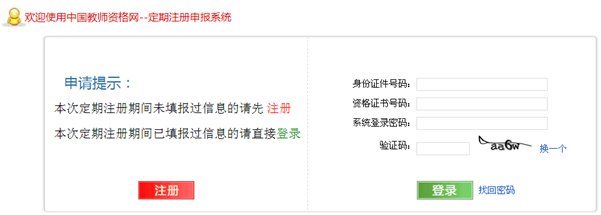 登录中国教师资格网(http://www.jszg.edu.cn),教师资格定期注册的申请人有两种途径进入申报系统。