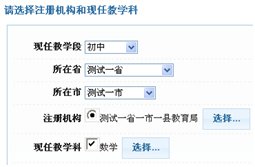 申请人须严格按照规定,根据任教学校所在地教育行政部门的定期注册工作安排,选择“注册机构”;根据学校里的教课情况,选择“现任教学段”和“现任教学科”。如下图