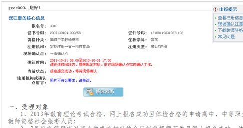 申请人登录网上申报系统后,可以查看教师资格定期注册申请各时间段的状态。