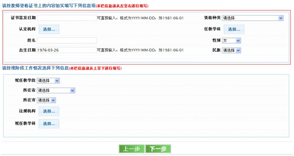说明:如果证书上的任教学科在信息系统中没有找到,请联系本省教师资格认定指导部门或者教育部教师资格认定指导中心将该任教学科添加到系统中。