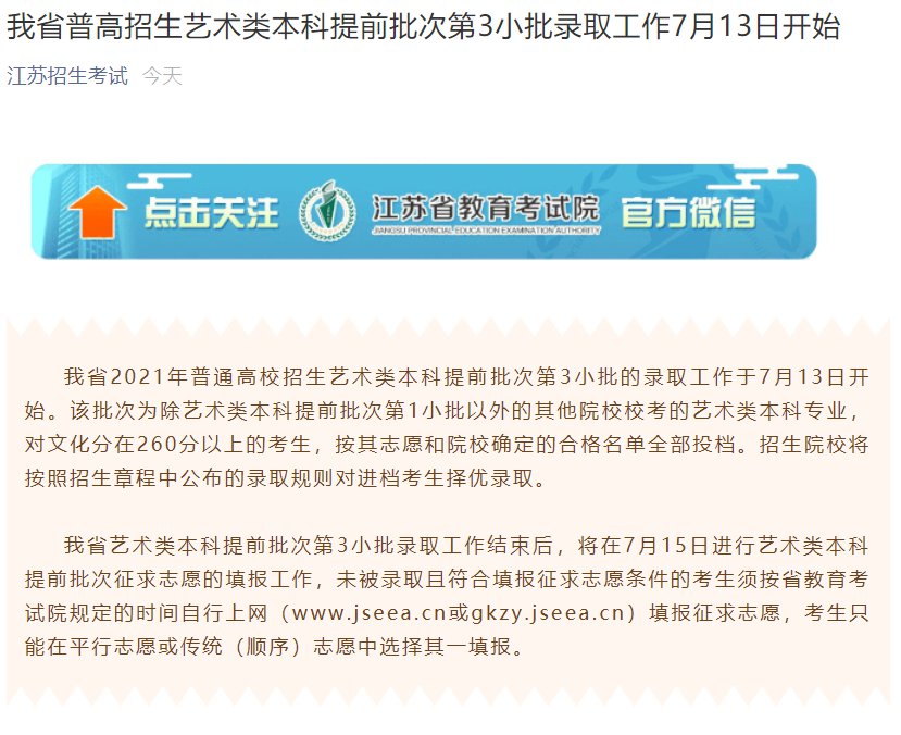 江苏省2021年普通高校招生艺术类本科提前批次第3小批的录取工作于7月13日开始。该批次为除艺术类本科提前批次第1小批以外的其他院校校考的艺术类本科专业,对文化分在260分以上的考生,按其志愿和院校确定的合格名单全部投档。招生院校将按照招生章程中公布的录取规则对进档考生择优录取。