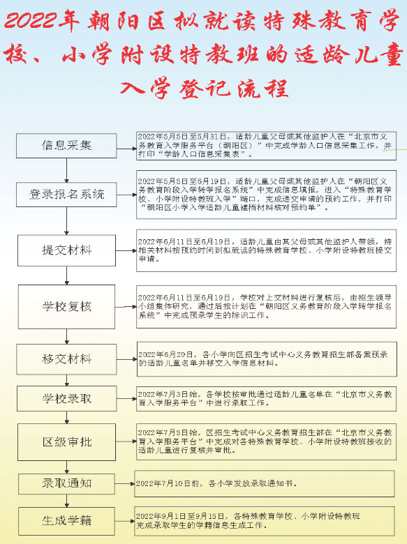 2022年北京市朝阳区幼升小残疾儿童入学需在“北京市义务教育入学服务平台(朝阳区)”中完成学龄人口信息采集工作并取得“学龄人口信息采集表”,后提交学龄人口信息采集表、全家户口簿等资料到学校所在地办理登记入学,入学指南如下: