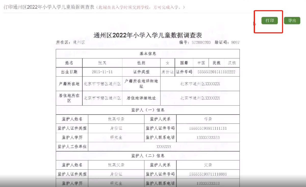 小编提醒:如果您的电脑没有连接打印机,可以点击右侧的“导出”按钮,保存电子版《通州区2022年小学入学儿童数据调查表》,前往打印店打印。
