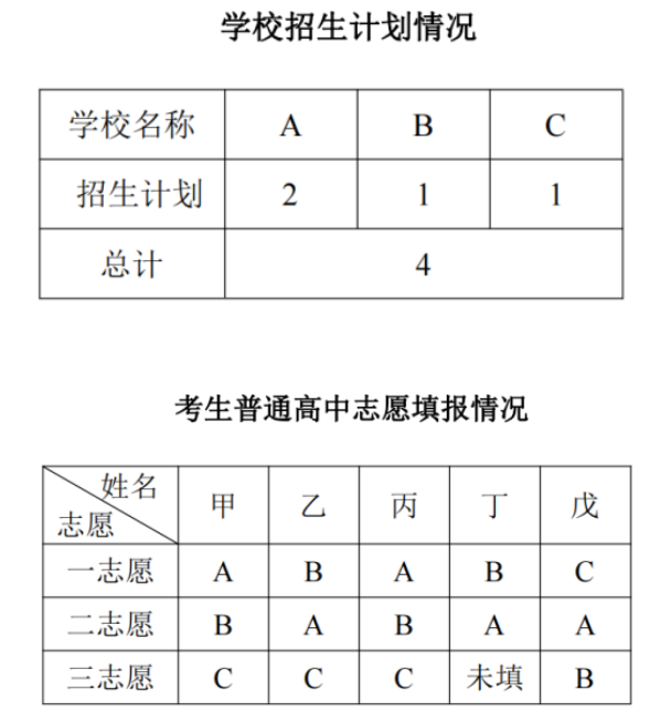 举例说明:共有A、B、C三所学校,招生计划分别为2个、1个、1个。有甲、乙、丙、丁、戊5名考生,成绩排序为甲最高、戊最低依次排序。即如下图所示情况: