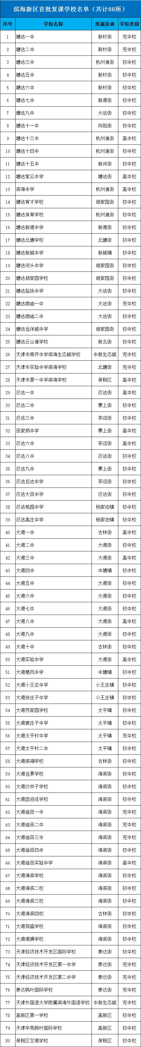 滨海新区第一批复课开学涉及80所学校,其中,涉及高三学生学校25所和初三学生学校68所(含13所完中校),涉及师生2万余人。