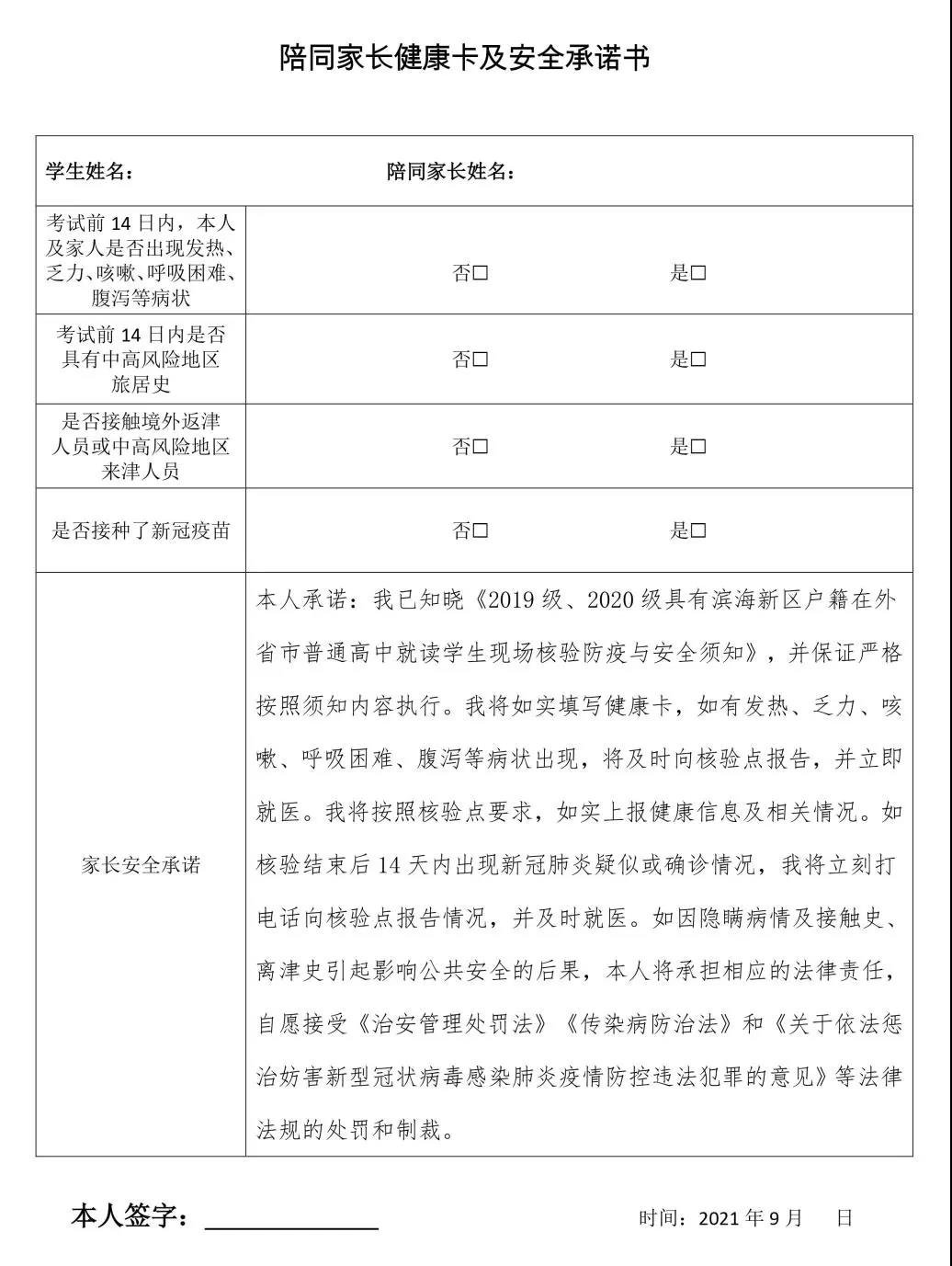 答:为保障2019级、2020级具有滨海新区户籍在外省市普通高中就读学生现场核验工作安全平稳顺利,转学生和陪同家长需要在滨海新区教育体育局官网下载《转学学生健康卡及安全承诺书》和《陪同家长健康卡及安全承诺书》,如实填写个人健康情况,签署安全承诺书并签字。现场核验时请将上述两个《承诺书》交给核验工作人员。