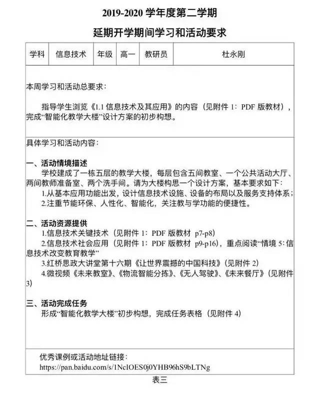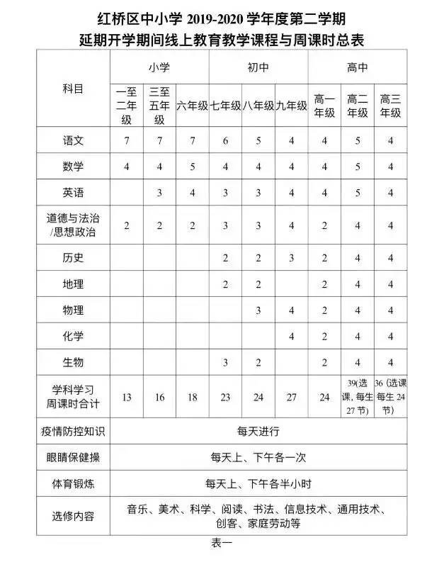 各学校根据区教育局整体部署和“线上教育教学课程与周课时总表(表一)”,依据国家课程计划,科学制定每个年级的课程和课时,既有规定的必修学习内容,又有符合学生居家生活特点的选修内容,形成“一校一方案”。学生将从2月10日起,在班主任和学科教师的指导下,迎来“一生一课表”式的线上个性化学习。德、智、体、美、劳、心理健康教育以及疫情防控等内容都会实现课程化,引导学生学会时间管理,明确学习内容,做好学习规划,确保学生既能在规定时间内完成各项学习任务,又能不断强化居家生活的习惯养成。