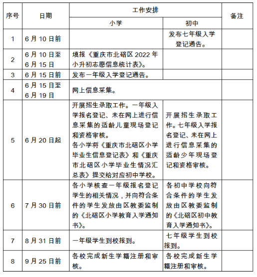 各中学依据小学提交的毕业学生名册发放由区教委监制的《北碚区初中教育入学通知书》。小学毕业生和适龄少年持本人入学通知书和小学毕业证在规定的时间到中学报到入学。区教委依据学校招生计划,对符合要求的学生予以注册学籍。