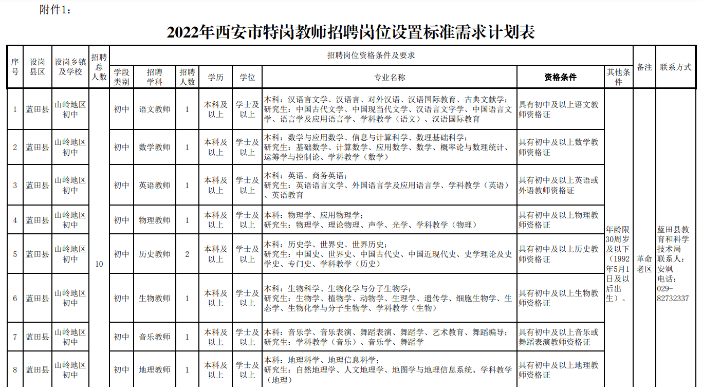 2022年西安市实施特岗计划招聘特岗教师80名,其中:蓝田县计划招聘特岗教师40名,周至县计划招聘特岗教师40名。