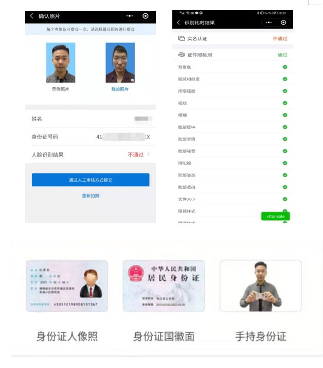 识别不通过时可以点击人脸识别结果查看不通过原因并重新尝试,当多次尝试不过后可以选择通过人工审核方式提交(需补充身份证正反面、手持身份证相片),等待人工审核(审核仍不通过的,及时与当地自学考试办公室联系咨询)。