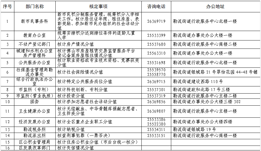 佛山勒流街道各职能部门积分入学核定事项及咨询电话: