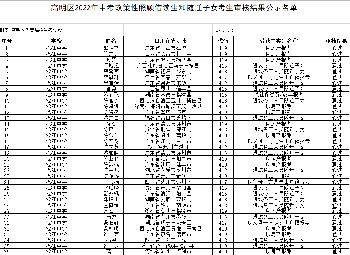 高明区2022年中考政策性照顾借读生和随迁子女考生审核结果名单公示