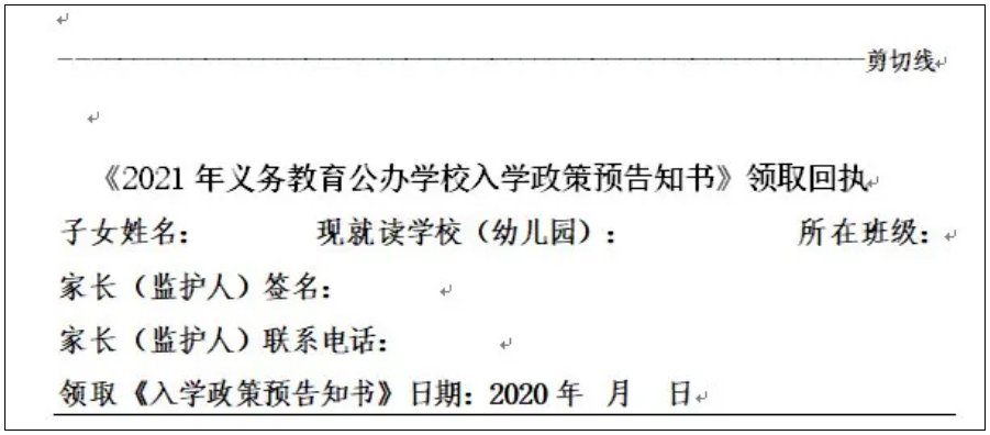 《2021年义务教育公办学校入学政策预告知书》由现就读学校(幼儿园)派发给每位毕业生家长,请家长领取并详细阅读后填写以下《回执》信息,并剪切《回执》交回给班主任登记存档。