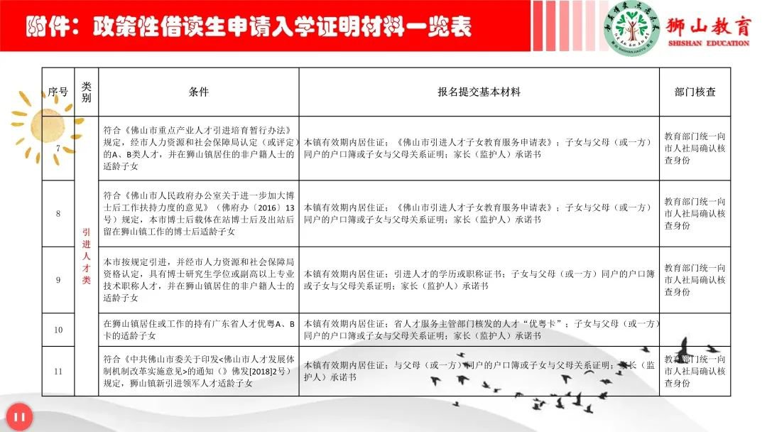 佛山市同一区内连续依法缴纳社会保险费满5年以上(含5年),有固定住址、有合法就业或经营证明,且连续在狮山镇居住满5年以上(含5年)的非户籍人士的适龄子女。家长必须提供以下3份材料,缺一不可。