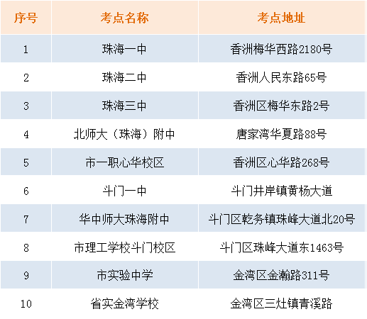 2022年珠海全市共设10个考点,今年新增华中师大珠海附中、市一职心华校区和市理工学校斗门校区3个考点,其中,市一职心华校区作为香洲区和高新区社青考生的考点,市理工学校斗门校区作为金湾区和斗门区社青考生的考点;开设424个普通考场、50个备用隔离考场。