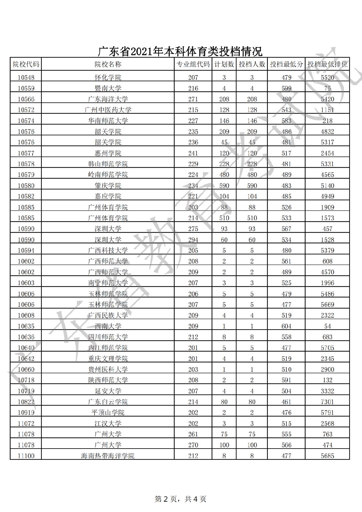 广东省2021年本科体育类投档情况