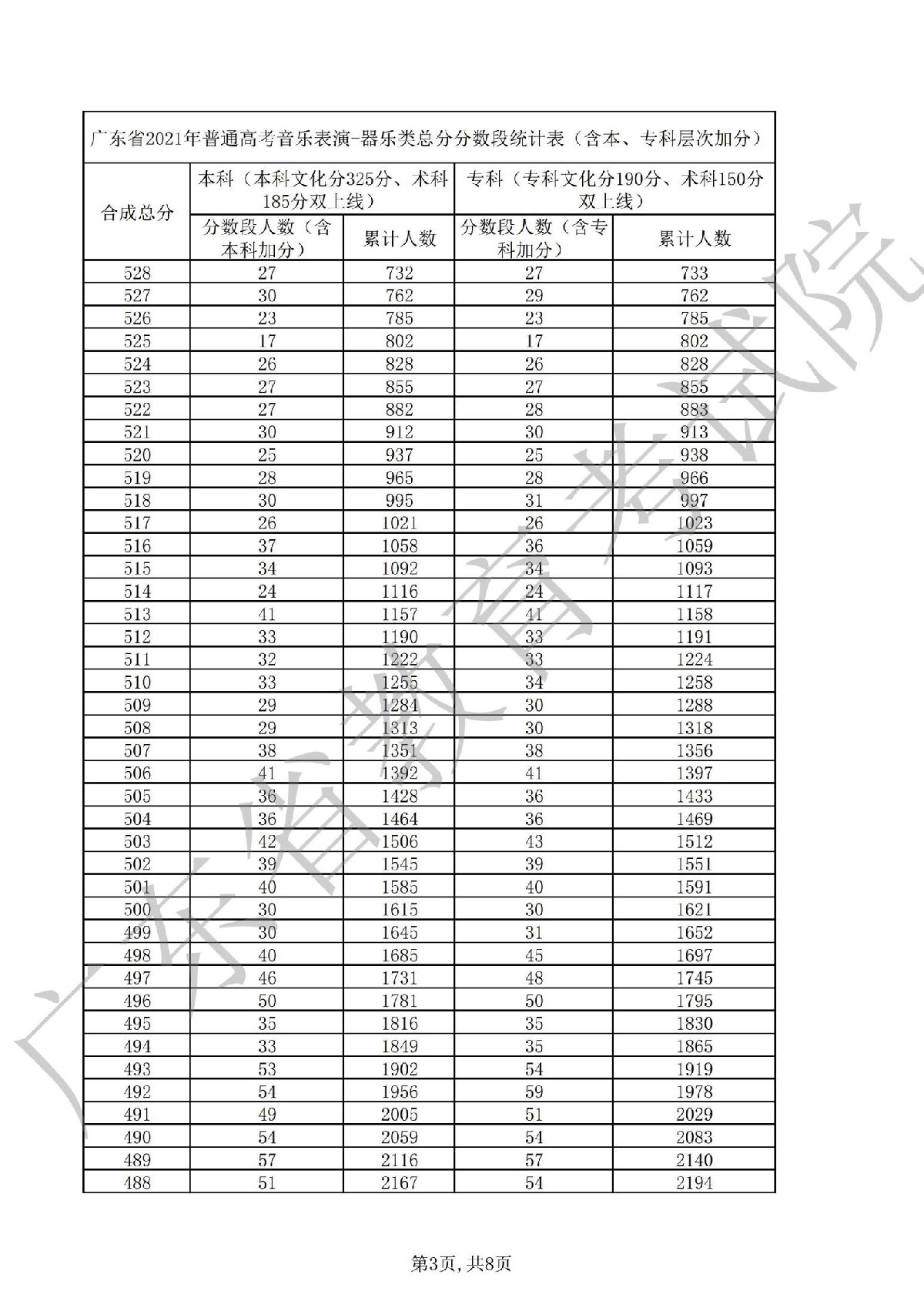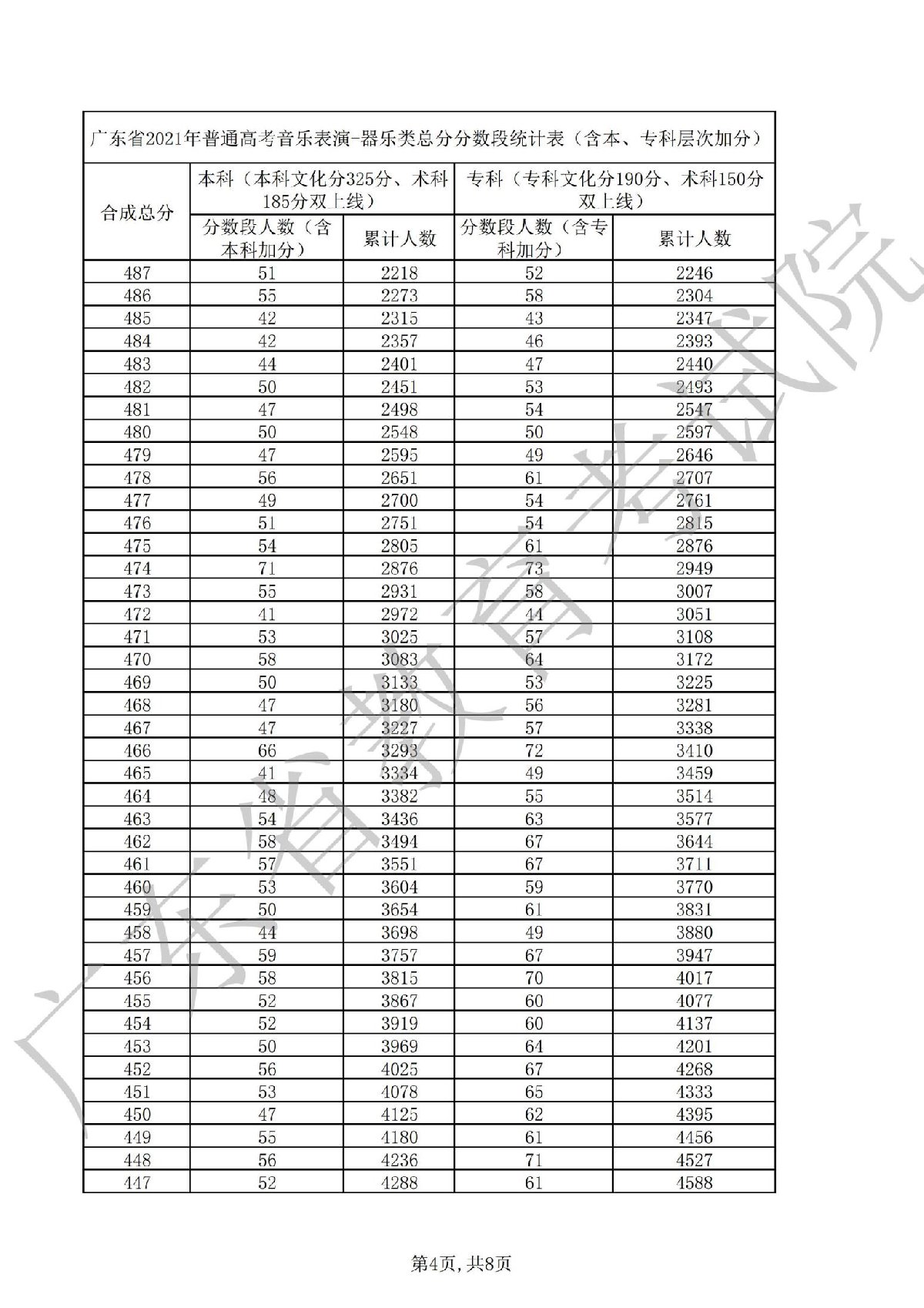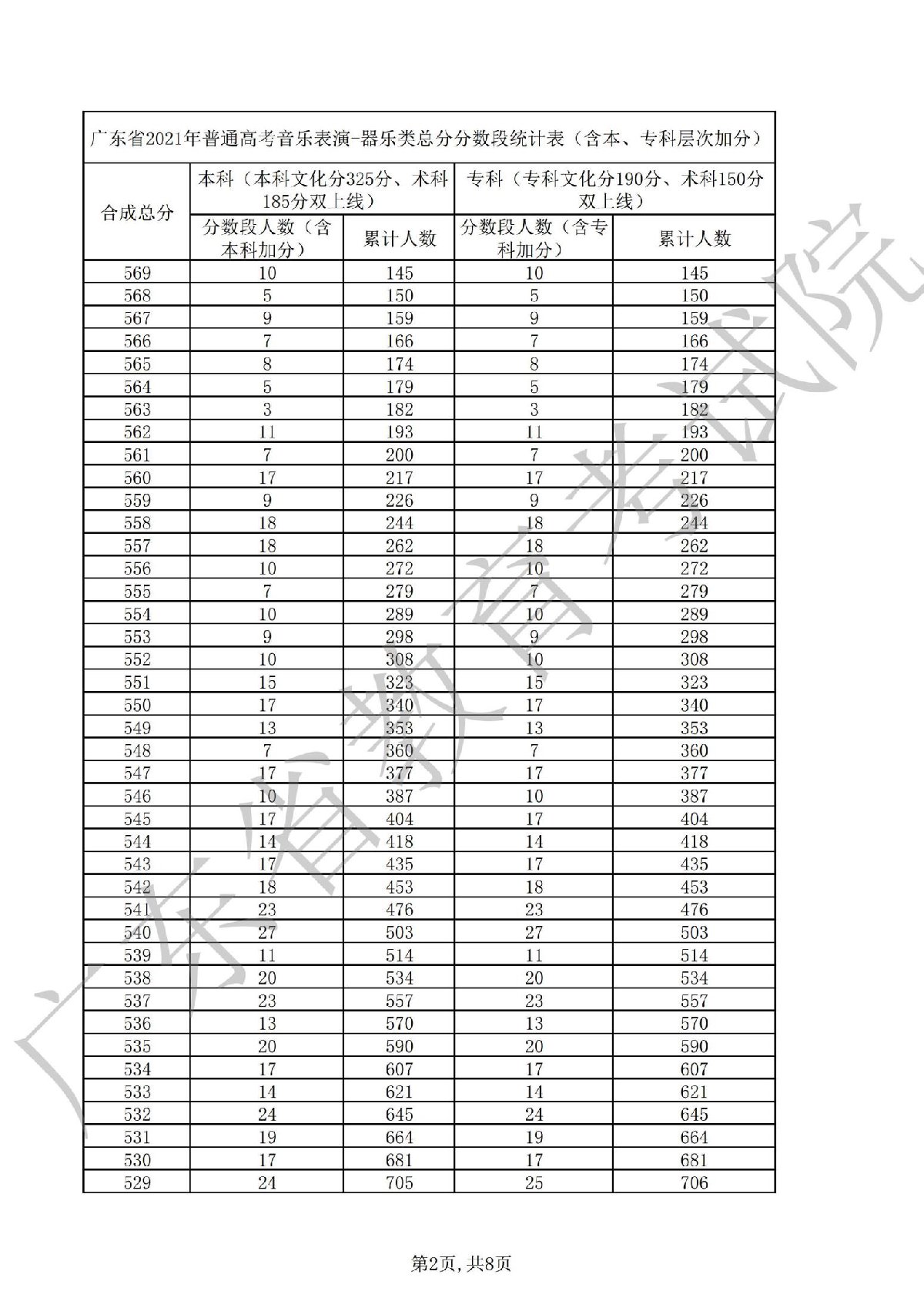 广东省2021年普通高考音乐表演-器乐类总分分数段统计表