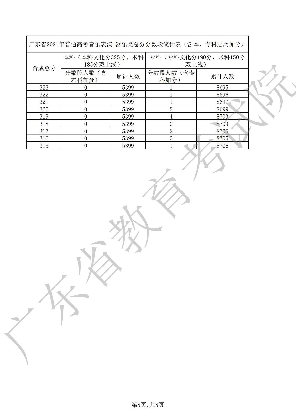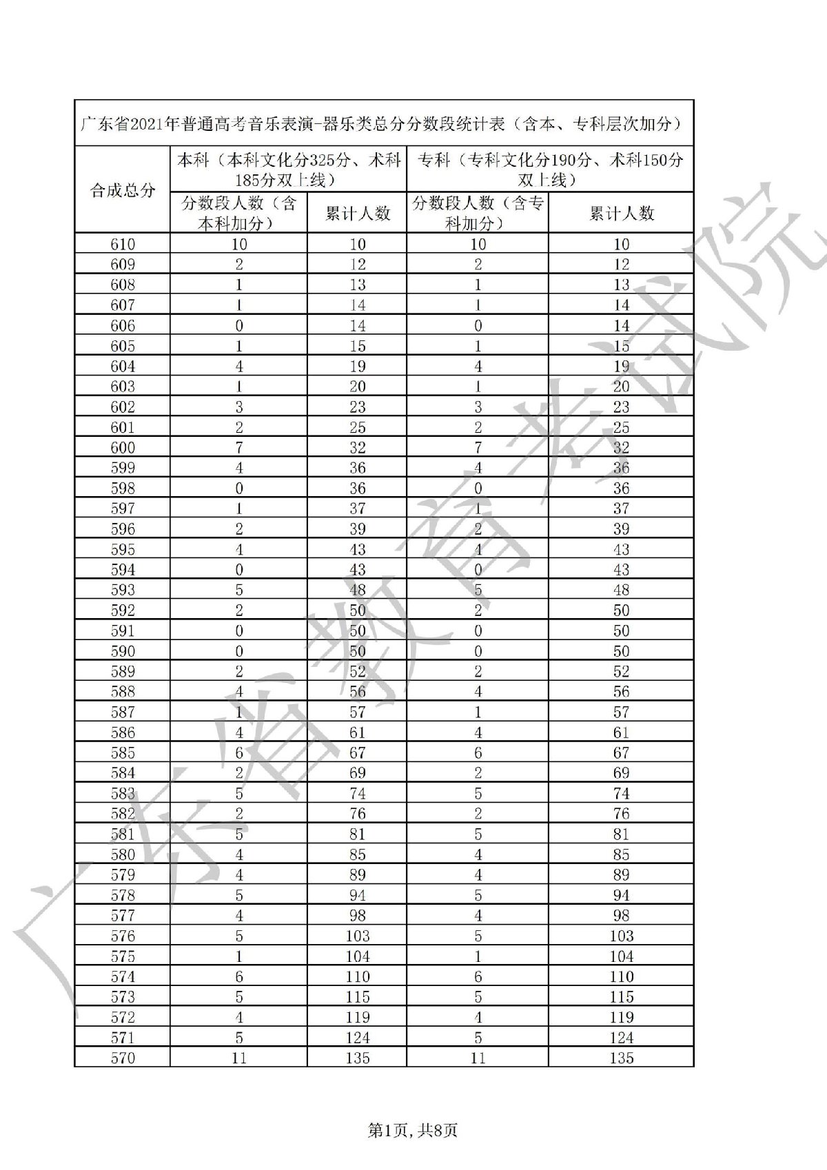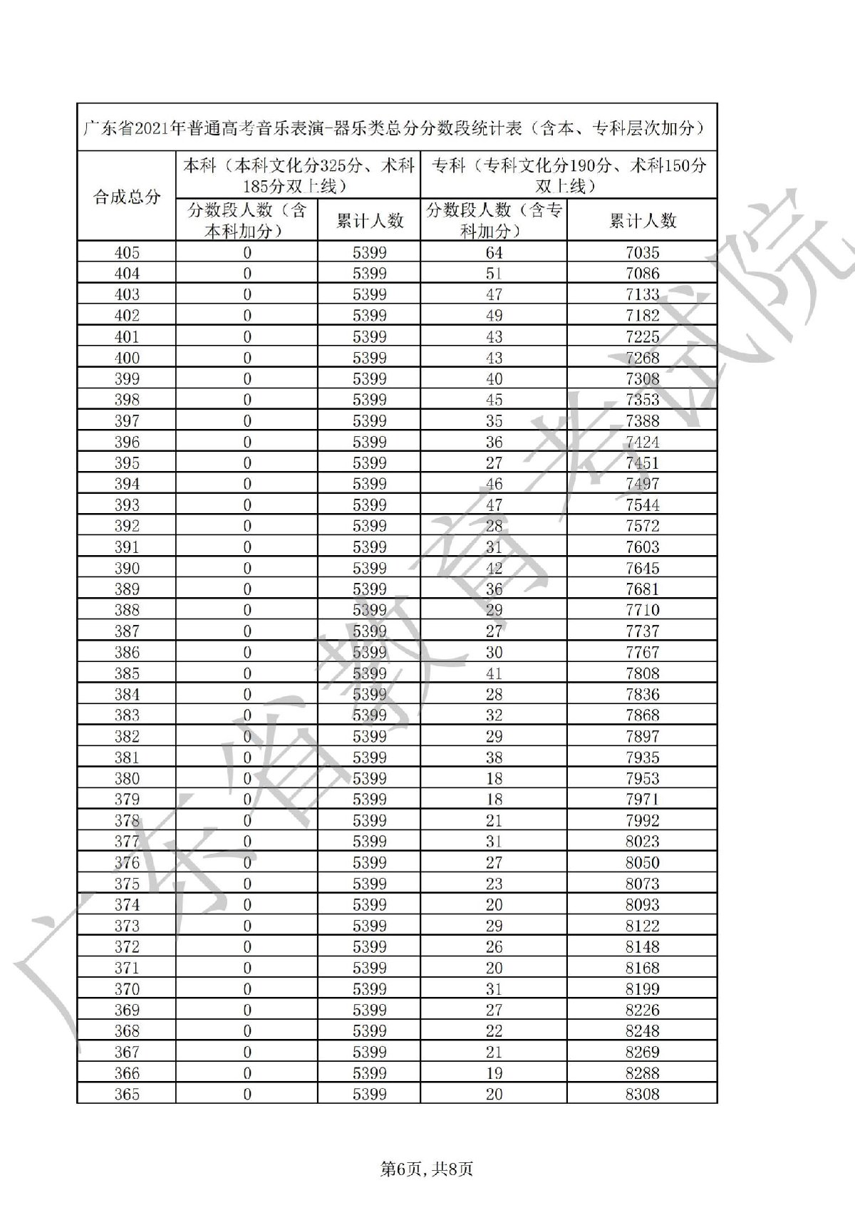 广东省2021年普通高考音乐表演-器乐类总分分数段统计表