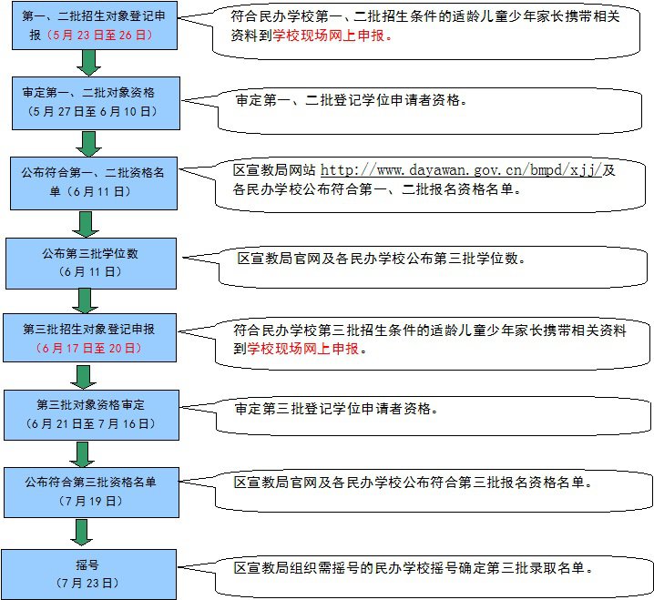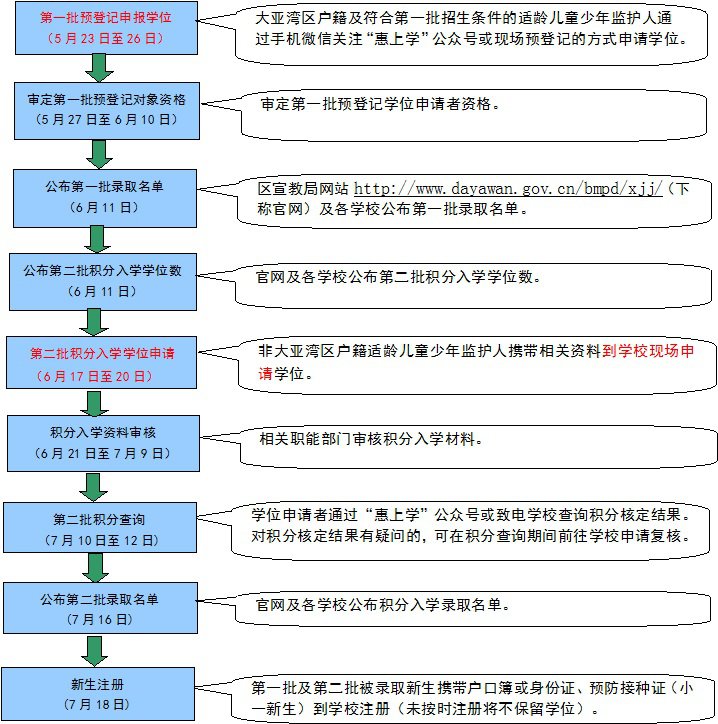 第一批:家长通过手机微信关注“惠上学”公众号,于5月23日早上8:00至26日下午18:00期间进入“大亚湾区公办学校一年级、七年级第一批网上报名系统”预登记申请学位。澳头第二小学、育英小学、西区第六小学、荷茶小学学区范围内的户籍适龄儿童及以下3种情况的学位预登记申请者需携带相关资料于5月23日至26日(早上8:30-12:00,下午2:30-17:30)到学校现场申请:①跨学区;②其父或母在大亚湾区投资、就业或与本地户籍配偶团聚并长期居住大亚湾的港澳台户籍适龄儿童少年;③网上预登记申请学位不成功的。