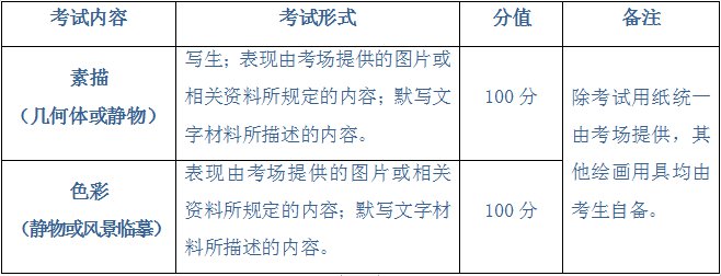 | 备注:素描为必考科目,报考美术特长生并兼报绘画专项的考生,需加考色彩。 | |||