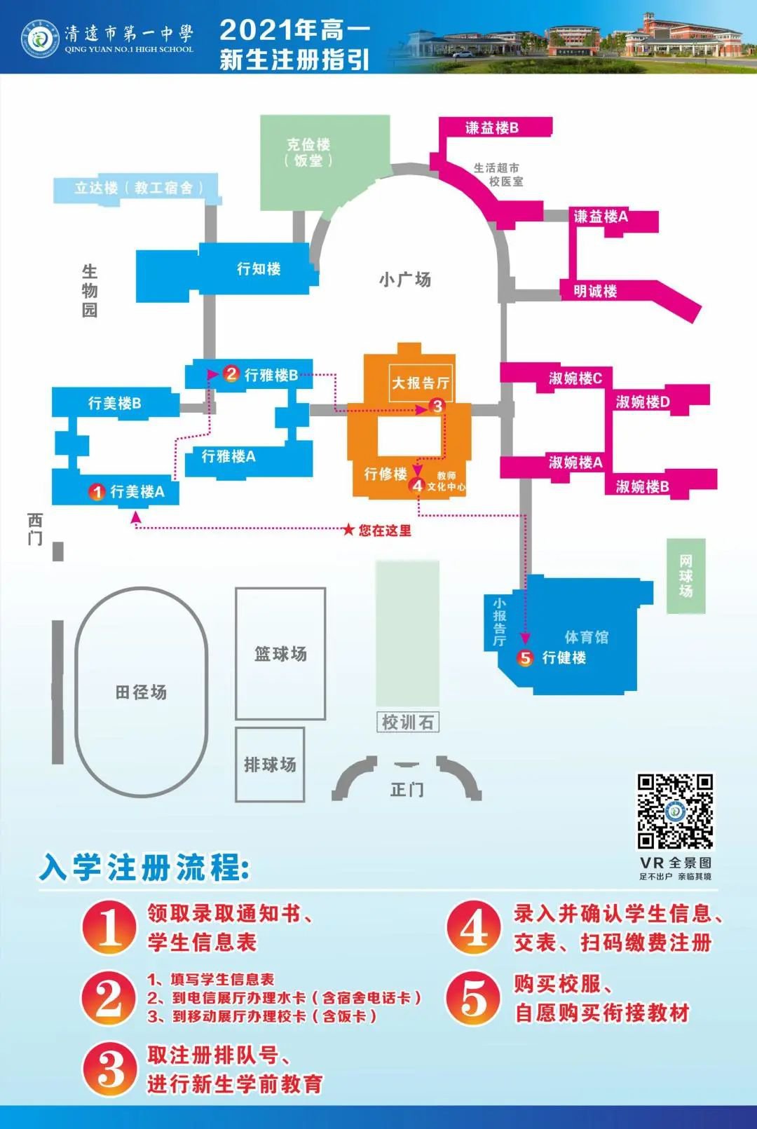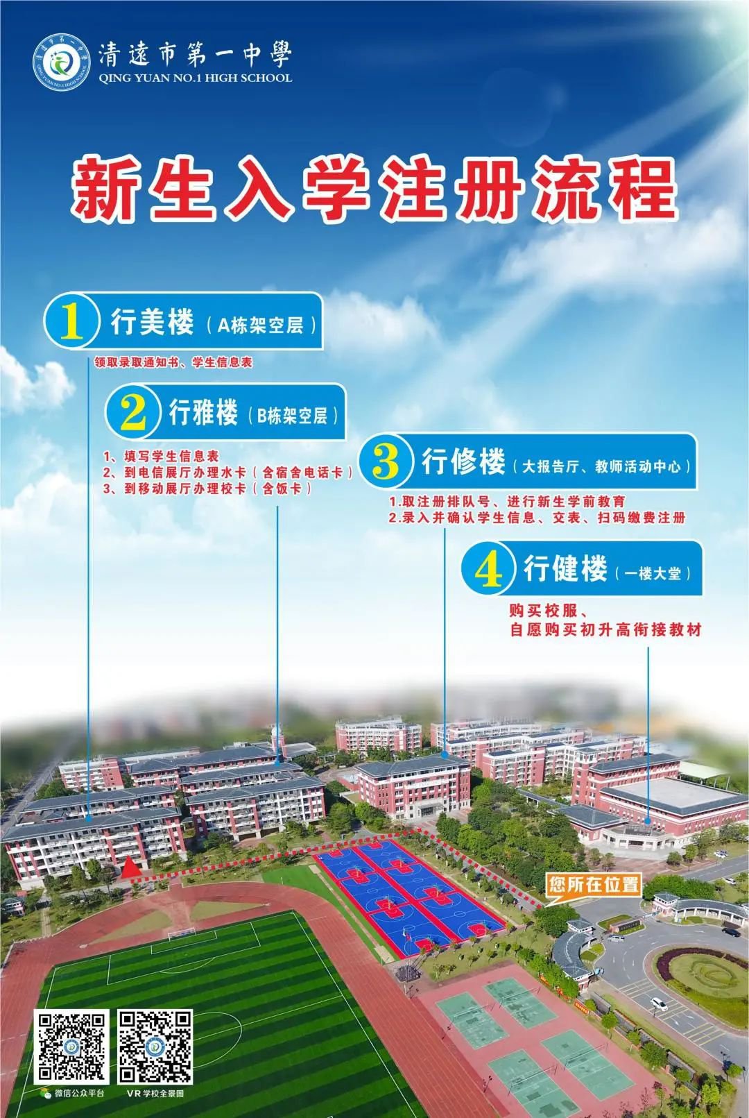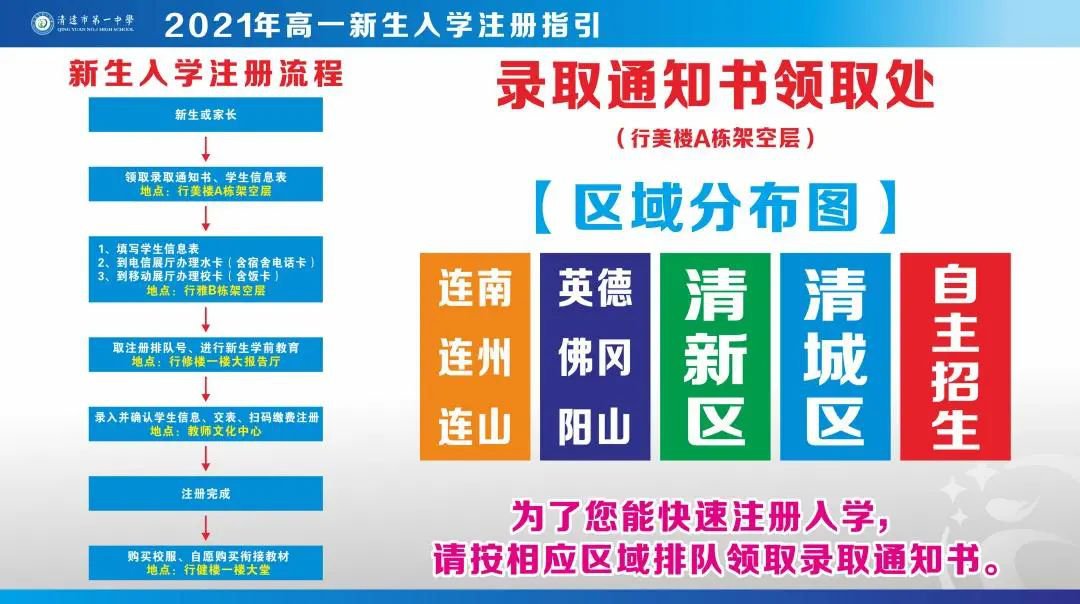 经清远市招生委员会划线投档,已确定我校2021年秋季高一新生录取名单。我校现定于7月16-17日(上午8:30—12:00,下午1:30—5:30)在我校领取录取通知书并现场注册,届时请携带学生本人的准考证进行注册。