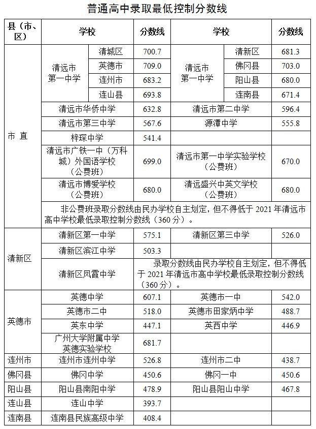 为确保招生计划的完成,普通高中最低录取控制分数线原则上不低于360分,在最低录取控制分数线内未完成招生任务的,报清远市招生考试委员会审批后可由各县(市、区)教育局和市直学校(或民办高中)适当调整录取控制分数线。