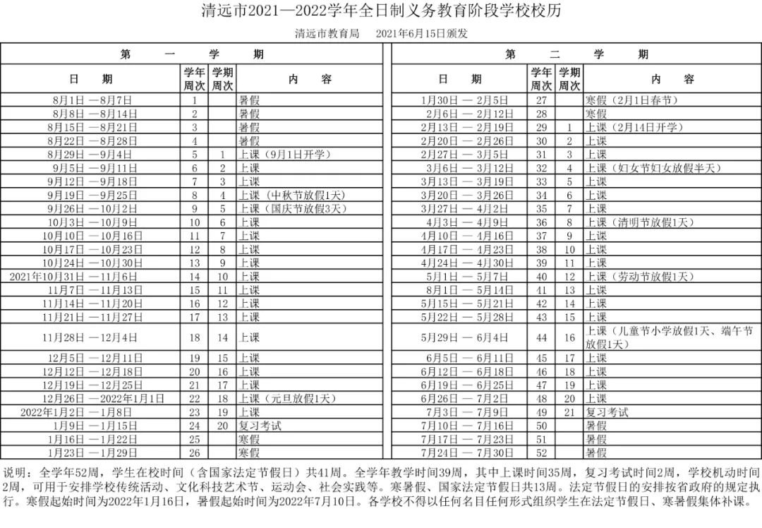 根据《清远市2020—2021学年全日制义务教育阶段学校校历》,《清远市2021—2022学年全日制义务教育阶段学校校历》