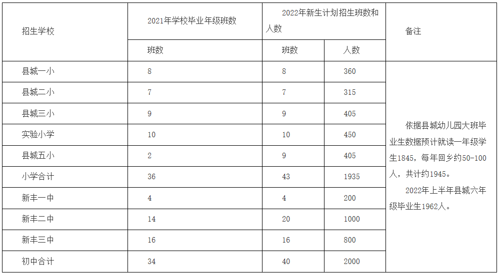 ➤新丰县2022年秋季县城义务教育阶段学校新生招生计划: