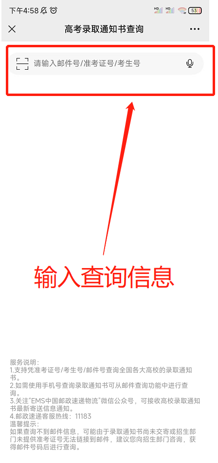 2.输入邮件号/准考证号/考生号,获取查询结果。