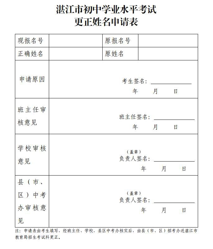 (四)县(市、区)教育局招生考试办公室要在3月30日前将旧生更正姓名申请表、考点安排情况表报湛江市教育局招生考试科。