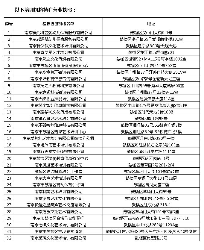 以下为鼓楼区社会培训机构(托育机构)复课督查第八批验收合格名单公示: