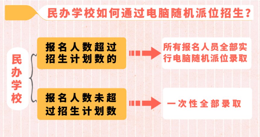 2020年,南京民办学校报名人数超过招生计划数的,所有报名人员全部实行电脑随机派位录取;报名人数未超过招生计划数的,一次性全部录取。民办一贯制学校初中部招生计划小于其小学部直升需求人数时,仅面向校内采取电脑随机派位方式录取;在保证小学部直升需求后仍有余额且多余名额少于报名人数的,也要采取电脑随机派位方式录取。