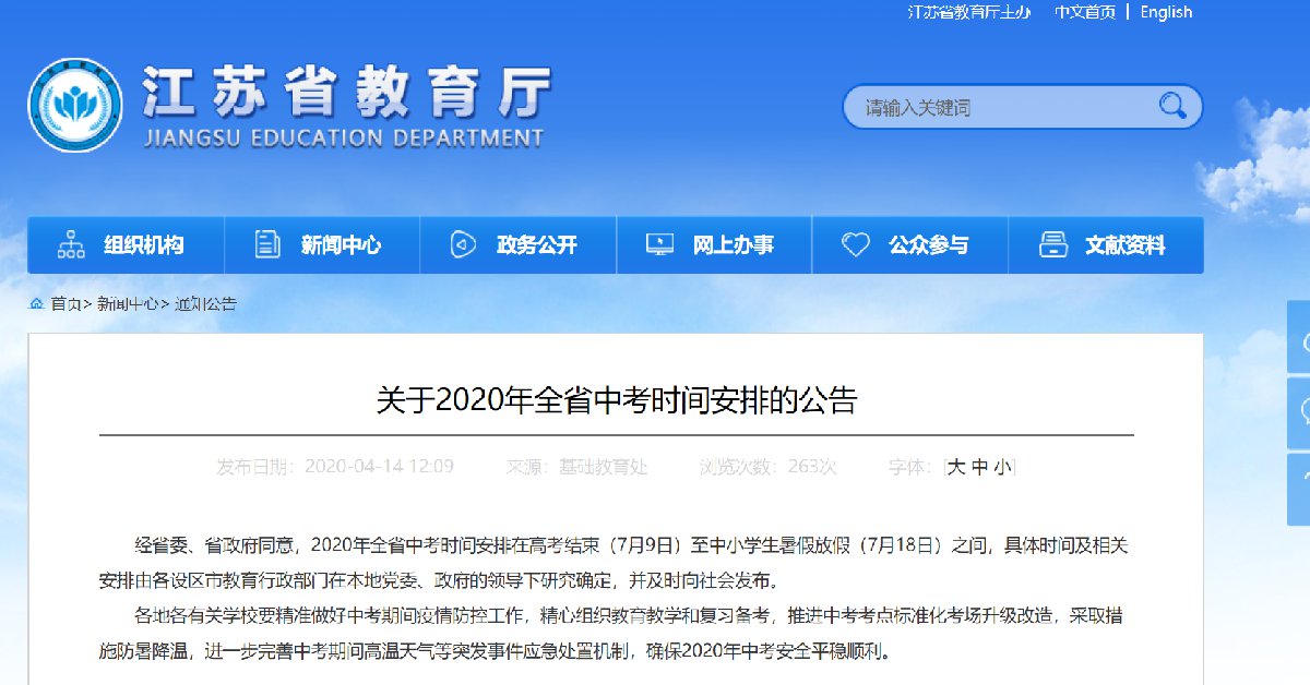 2020年4月14日,江苏教育厅发布关于全省2020年中考时间安排的最新通知: