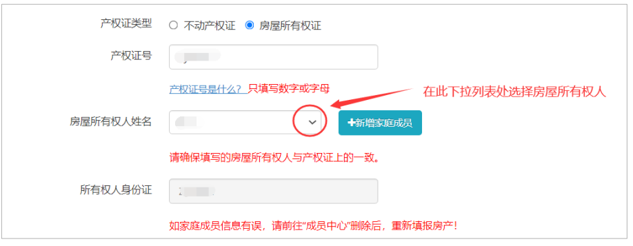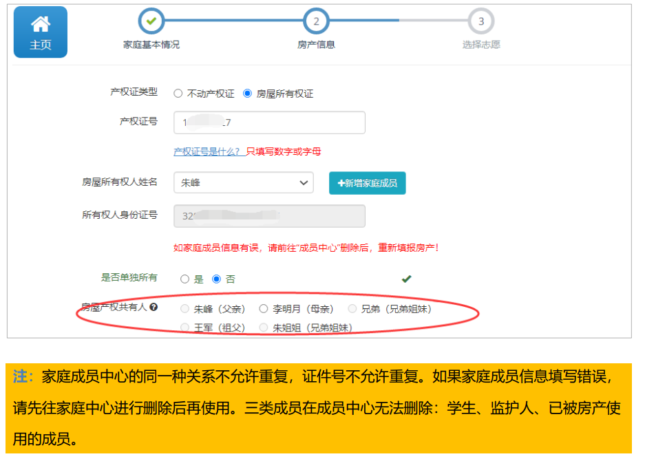 这里的房屋所有权人,数据自动加载填报过程中的学生及监护人信息,填报人根据实际情况, 在下拉列表处选择房屋所有权人。如果房屋所有权人信息还没有添加的,点击“新增家庭成员”按 钮进行人员新增(若有房屋共有人需要添加,也是点击“新增家庭成员”按钮,进行新增),添加 房屋所有权人的信息后,再在房屋所有权人姓名处进行调用。