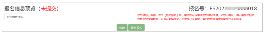 通过报名信息预览可以查看所填写的所有信息。如果您核对无误后可点击“提交报名”。如果 还需修改,请点击“修改”进行信息修改。 如果确认无误后,提交报名。