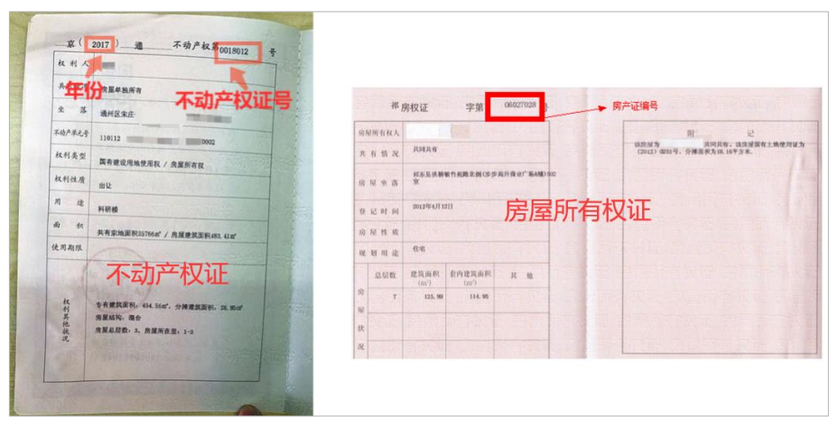 不动产权证和房屋所有权证图例如下图所示,填报人根据自己的房产类型进行填报。