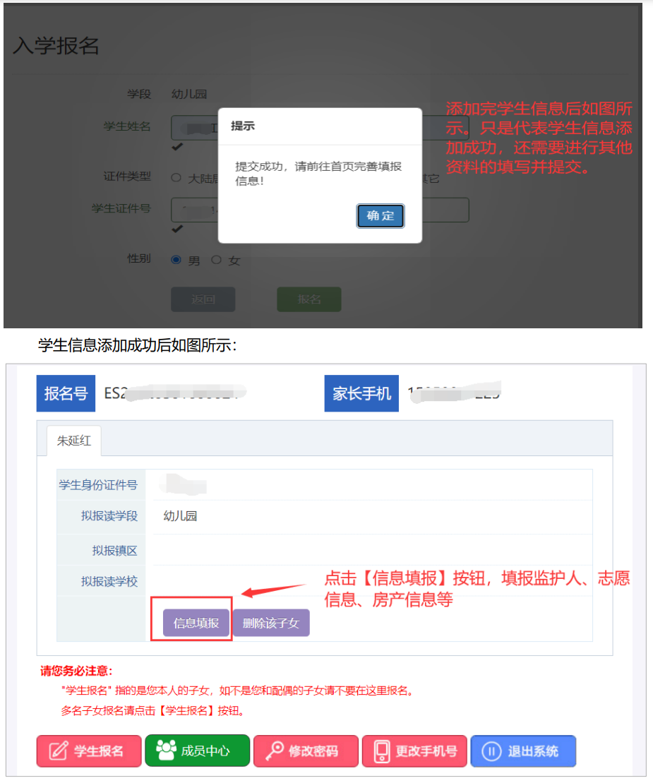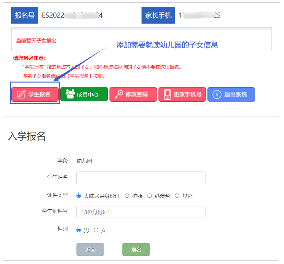 2.申请人根据实际情况进行一个或多个子女的入学报名。如果您登录后尚未添加子女信息,请点 击【学生报名】按钮,添加需要就读幼儿园的子女基本信息。填写学生姓名、学生证件类型及学生 身份证号码,确认无误后点击【报名】按钮进行提交。 若同一个家庭如果还有其他子女也需要就读幼儿园起始年级,同样点击【学生报名】按钮,进 行添加。