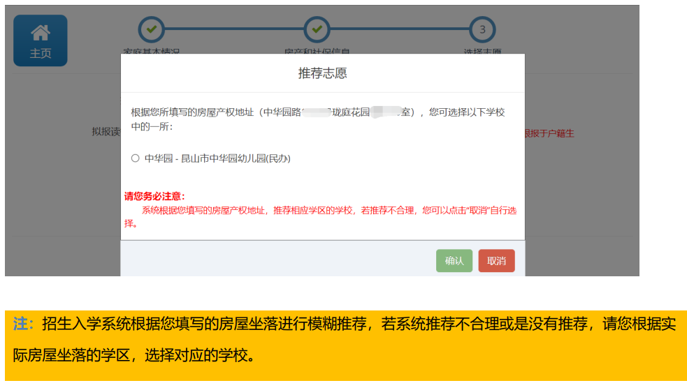 选择拟报读区镇和拟报读区镇内的学校。 为了方便填报,系统根据您所填报房屋坐落自动推荐相应学区的学校(如下图所示),若推 荐合理,您可直接勾选该学校并进行确认。 若系统匹配出多个学校,请您根据实际居住地的学区,选择对应的学校。 若系统推荐不合理,您可以点击“取消”按钮,根据实际情况选择学区内的学校。